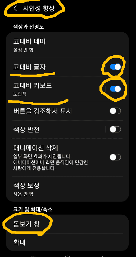 - 여기서 ‘고대비 글자’, ‘고대비 키보드’ 기능을 활성화하세요.