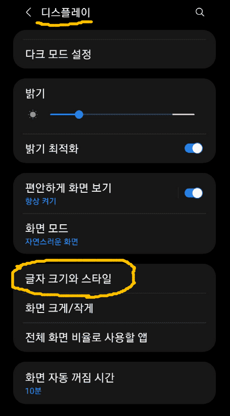 - 메뉴에서 ‘디스플레이’ → ‘글자 크기와 스타일’로 이동합니다.