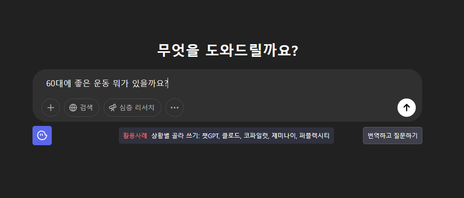 예: “60대에게 좋은 운동 뭐가 있을까요?” - 엔터(enter) 치고 기다리면 답이 뚝딱!